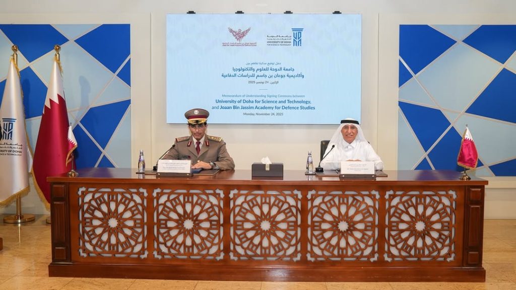 وقّعت أكاديمية جوعان بن جاسم للدراسات الدفاعية، ممثلة بالعميد الركن (دكتور) راجح محمد النابت رئيس الأكاديمية، مذكرة تفاهم استراتيجية مع جامعة الدوحة للعلوم والتكنولوجيا، ممثلة بسعادة الدكتور سالم بن ناصر النعيمي رئيس الجامعة.